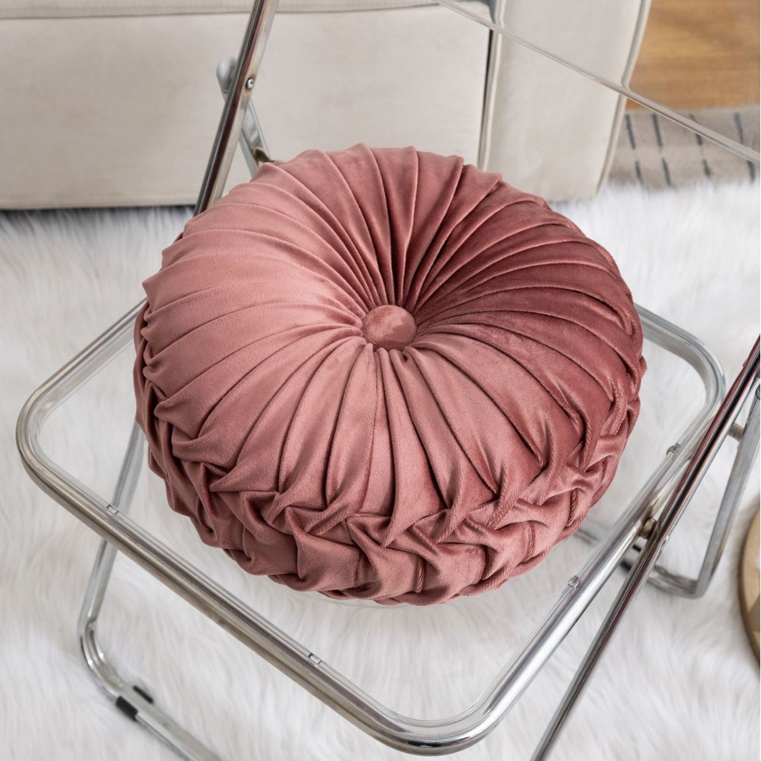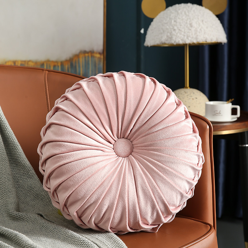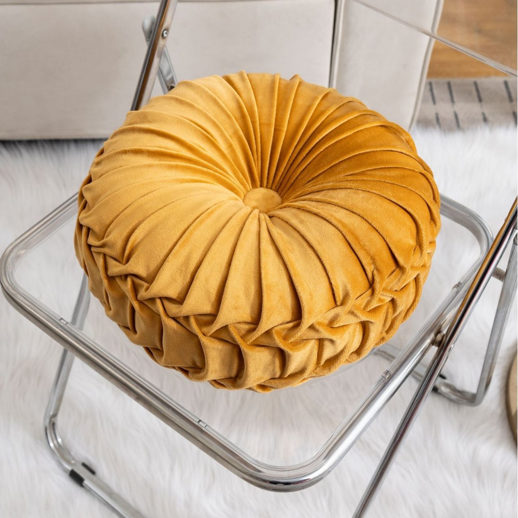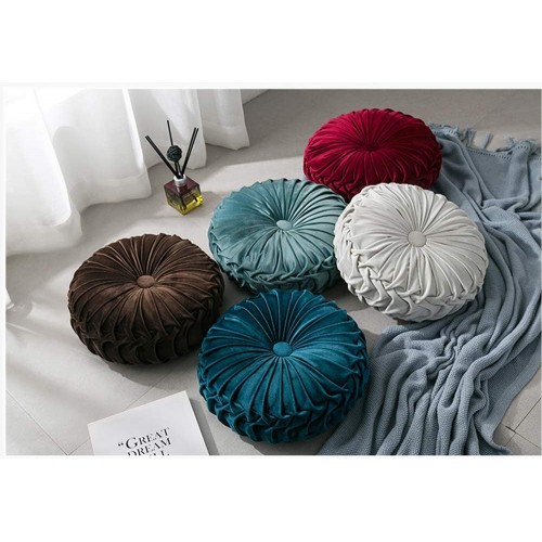Add a touch of timeless sophistication to your living space with our 14-Inch Velvet Pleated Round Pumpkin Pillow. This exquisite cushion is more than just a home accessory; it is a handcrafted statement piece designed to bring luxury and comfort to any setting. Featuring a unique vintage-inspired pumpkin silhouette, the pillow is defined by its intricate, hand-folded pleats that radiate from a central matching button, creating a beautiful 3D texture that catches the light from every angle.