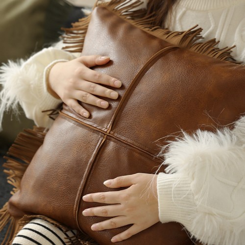 The prominent fringe detailing along the edges adds a playful and textural element to the pillow cover. These flowing fringes create movement and visual interest, enhancing the bohemian and artisanal vibe of the design. The combination of the smooth faux leather and the tactile fringe makes this pillow cover a truly unique and eye-catching accent piece.