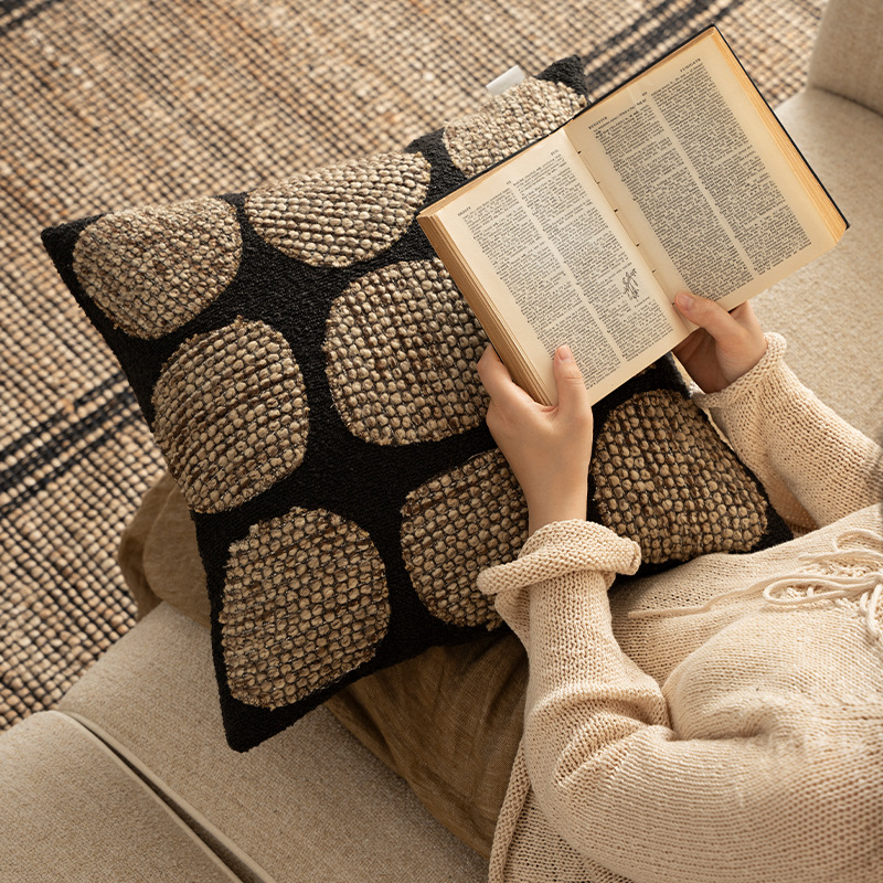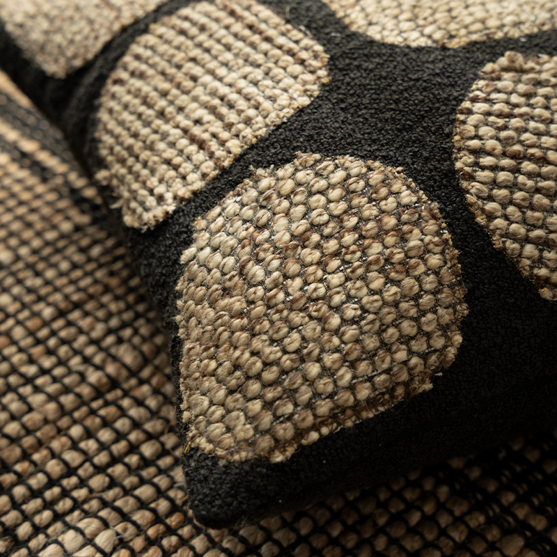 Tags: textured throw pillow, polka dot cushion, tufted decorative pillow, hand-woven accent pillow, modern boho home decor, black and tan throw pillow.