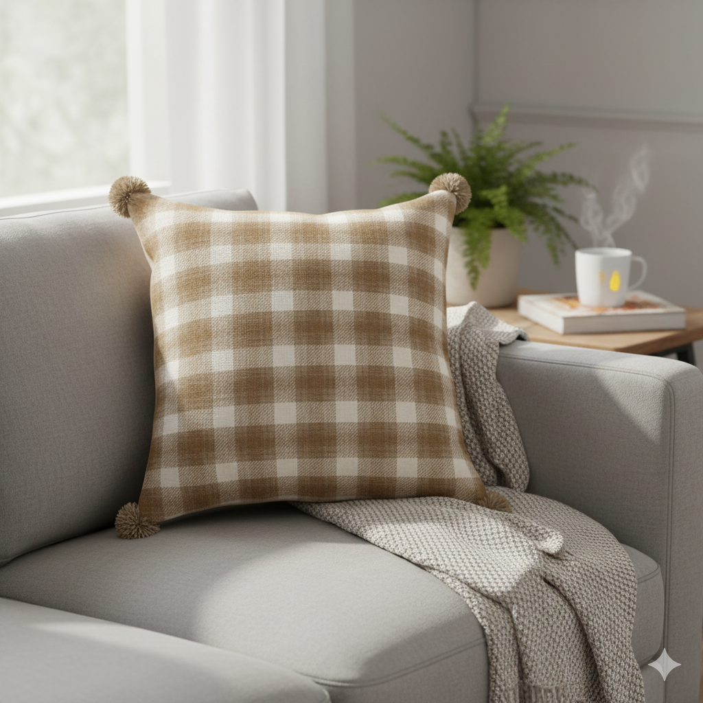 Tags: woven plaid pillow cover, pom pom cushion cover, cotton throw pillow, 45x45 cm sofa pillow, holiday vibe pillow, festive pillow cover, cozy sofa cushion, decorative pillow, home decor pillow cover